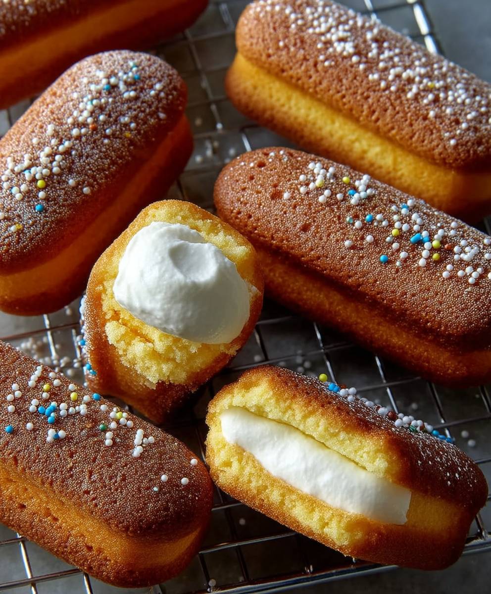 Enjoy the nostalgic taste of homemade Twinkies, featuring soft sponge cakes filled with creamy whipped filling and a classic coating. Perfect for satisfying your sweet tooth or as a delightful dessert!
