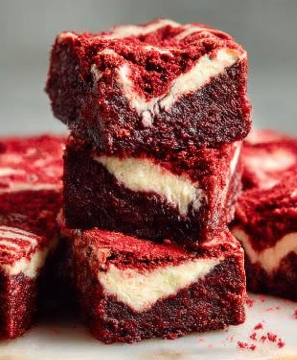 Indulge in rich and vibrant Red Velvet Brownies topped with creamy cream cheese frosting. These fudgy brownies offer a delightful twist on classic red velvet cake, making them perfect for any occasion.